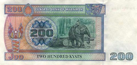 Кьят Мьянма. Купюра номиналом в 200 MMK, реверс.