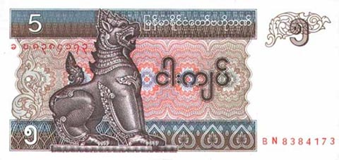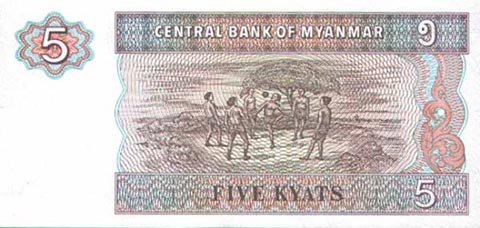 Кьят Мьянма. Купюра номиналом в 5 MMK, реверс.