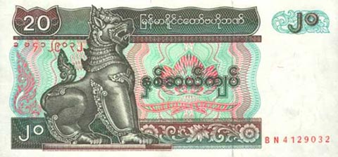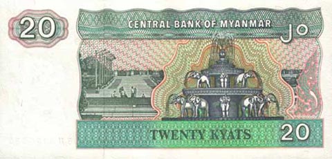 Кьят Мьянма. Купюра номиналом в 20 MMK, реверс.