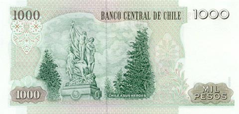 Чилийские песо. Купюра номиналом в 1000 CLP, реверс.