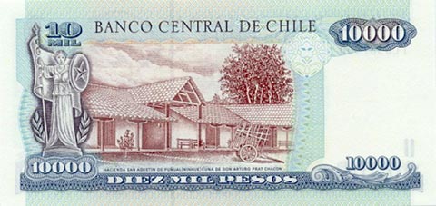 Чилийские песо. Купюра номиналом в 10000 CLP, реверс.