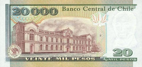 Чилийские песо. Купюра номиналом в 20000 CLP, реверс.