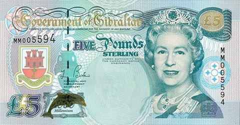 Гибралтарский фунт. Купюра номиналом в 5 GIP, аверс.