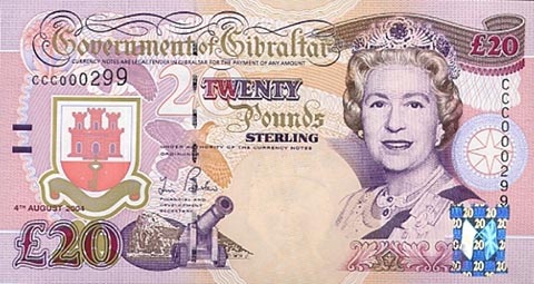 Гибралтарский фунт. Купюра номиналом в 20 GIP, аверс.