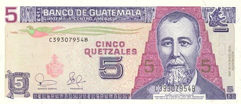 Гватемальский кетсаль. Купюра номиналом в 5 GTQ, аверс.