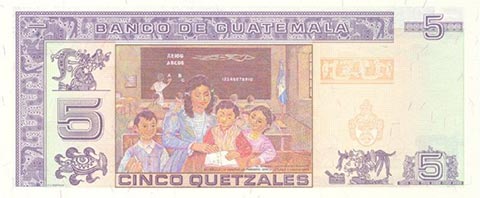 Гватемальский кетсаль. Купюра номиналом в 5 GTQ, реверс.