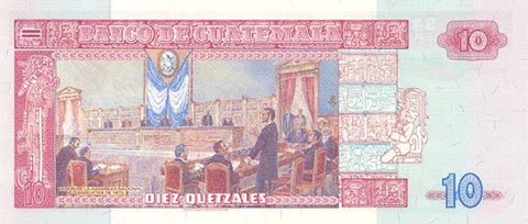 Гватемальский кетсаль. Купюра номиналом в 10 GTQ, реверс.