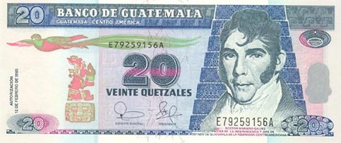 Гватемальский кетсаль. Купюра номиналом в 20 GTQ, аверс.