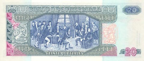 Гватемальский кетсаль. Купюра номиналом в 20 GTQ, реверс.