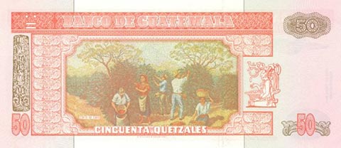 Гватемальский кетсаль. Купюра номиналом в 50 GTQ, реверс.