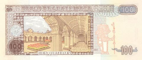 Гватемальский кетсаль. Купюра номиналом в 100 GTQ, реверс.