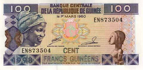 Гвинейский франк. Купюра номиналом в 100 GNF, аверс.