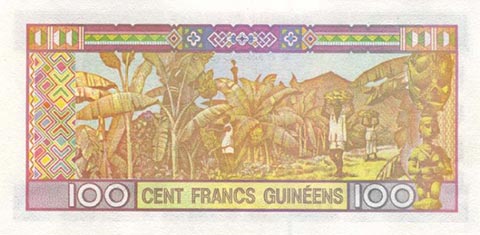 Гвинейский франк. Купюра номиналом в 100 GNF, реверс.