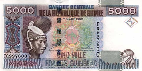 Гвинейский франк. Купюра номиналом в 5000 GNF, аверс.
