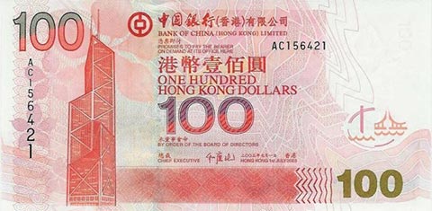 Гонконгский доллар. Купюра номиналом в 100 HKD, реверс.