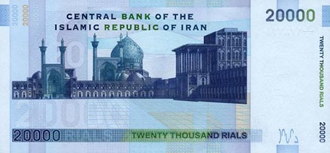 Иранский риал. Купюра номиналом в 20000 IRR, реверс.