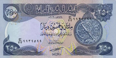 Иракский динар. Купюра номиналом в 250 IQD, аверс.