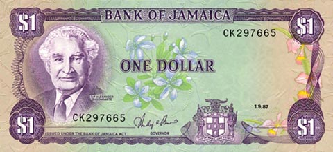Ямайский доллар. Купюра номиналом в 1 JMD, реверс.