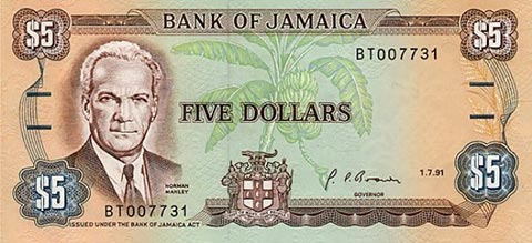 Ямайский доллар. Купюра номиналом в 5 JMD, аверс.