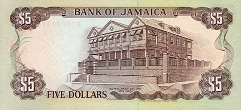 Ямайский доллар. Купюра номиналом в 5 JMD, реверс.