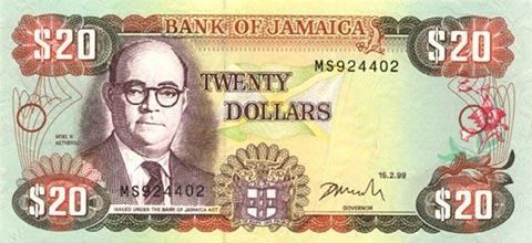 Ямайский доллар. Купюра номиналом в 20 JMD, аверс.