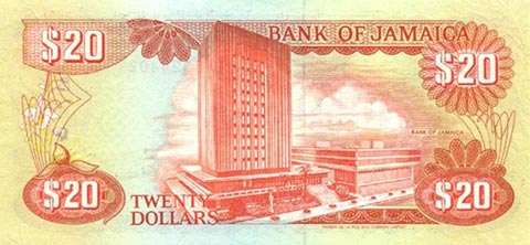Ямайский доллар. Купюра номиналом в 20 JMD, реверс.