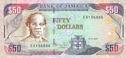 Ямайский доллар. Купюра номиналом в 50 JMD, аверс.