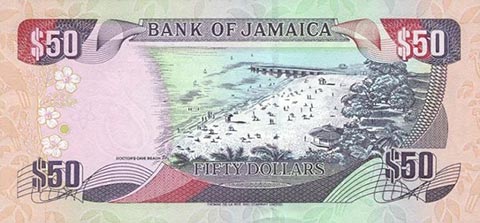 Ямайский доллар. Купюра номиналом в 50 JMD, реверс.