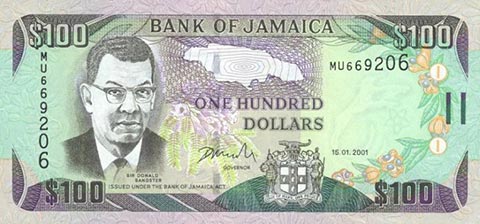 Ямайский доллар. Купюра номиналом в 100 JMD, аверс.