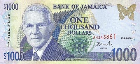 Ямайский доллар. Купюра номиналом в 1000 JMD, аверс.