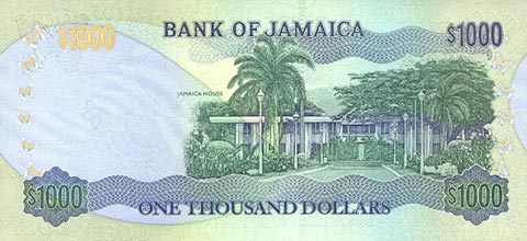 Ямайский доллар. Купюра номиналом в 1000 JMD, реверс.
