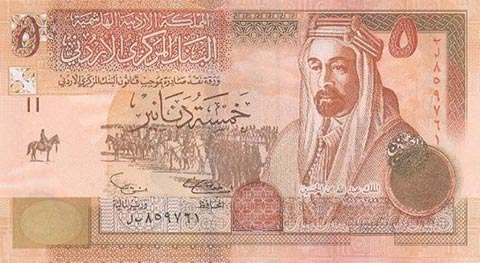 Иорданский динар. Купюра номиналом в 5 JOD, аверс.