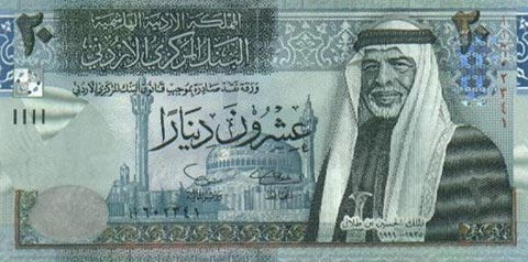 Иорданский динар. Купюра номиналом в 20 JOD, аверс.