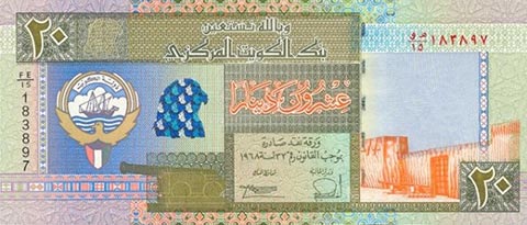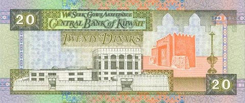 Кувейтский динар. Купюра номиналом в 20 KWD, реверс.
