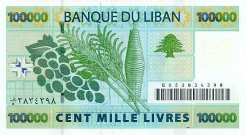 Ливанский фунт. Купюра номиналом в 100000 LBP, аверс.