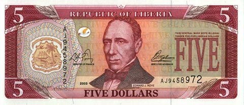 Либерийский доллар. Купюра номиналом в 5 LRD, аверс.
