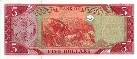 Либерийский доллар. Купюра номиналом в 5 LRD, реверс.
