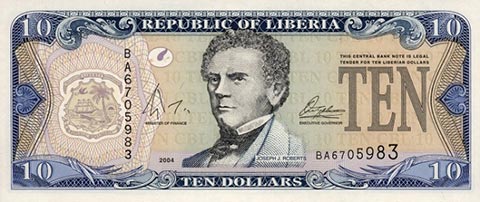 Либерийский доллар. Купюра номиналом в 10 LRD, аверс.
