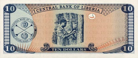Либерийский доллар. Купюра номиналом в 10 LRD, реверс.
