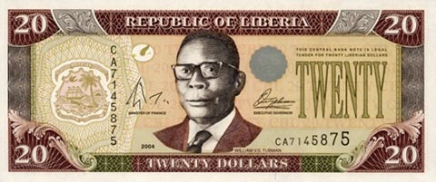 Либерийский доллар. Купюра номиналом в 20 LRD, аверс.