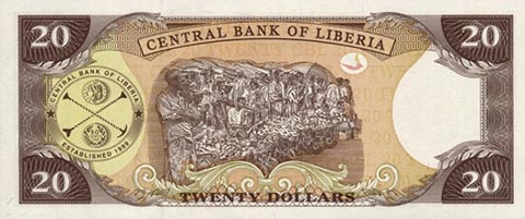 Либерийский доллар. Купюра номиналом в 20 LRD, реверс.