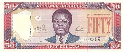 Либерийский доллар. Купюра номиналом в 50 LRD, аверс.