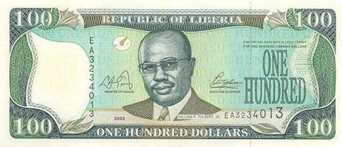 Либерийский доллар. Купюра номиналом в 100 LRD, аверс.