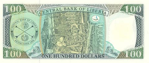 Либерийский доллар. Купюра номиналом в 100 LRD, реверс.