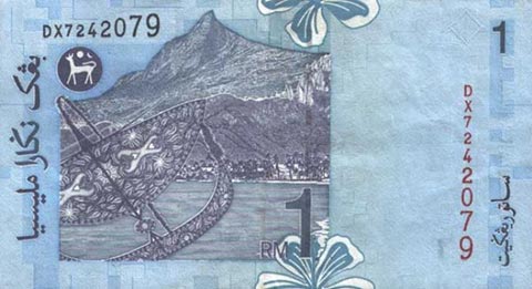 Малазийские ринггит. Купюра номиналом в 1 MYR, реверс.