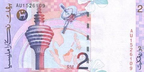 Малазийские ринггит. Купюра номиналом в 2 MYR, реверс.