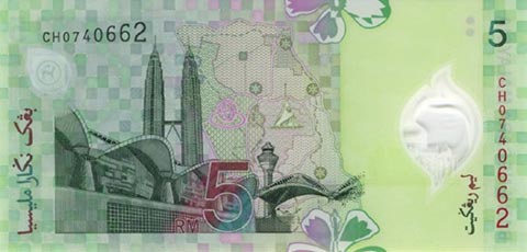 Малазийские ринггит. Купюра номиналом в 5 MYR, реверс.