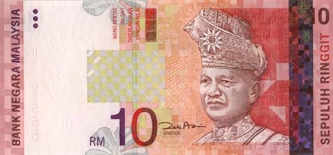 Малазийские ринггит. Купюра номиналом в 10 MYR, аверс.