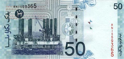 Малазийские ринггит. Купюра номиналом в 50 MYR, реверс.