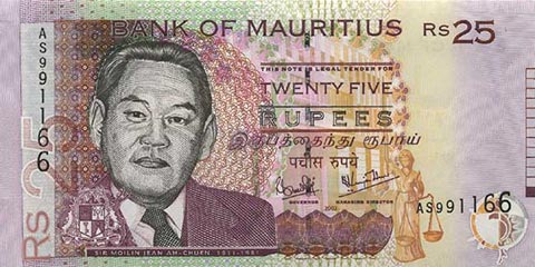 Маврикийская рупия. Купюра номиналом в 25 MUR, аверс.